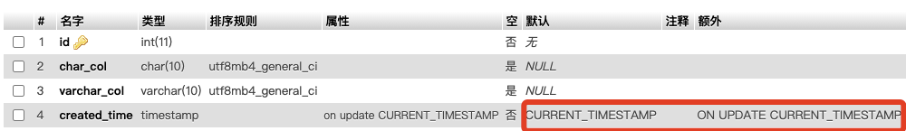 可以看到mysql 给的默认值就是当前时间戳 current_timestamp,并且有个 on update current_timestamp表示会随之更新:
