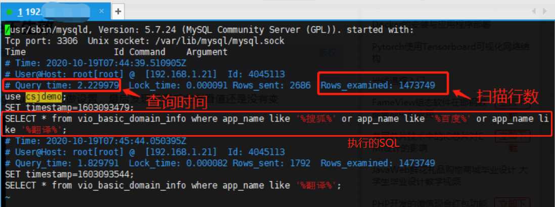 - 第三行:执行花费的时间【单位:秒】、执行获得锁的时间、获得的结果行数、扫描的数据行数