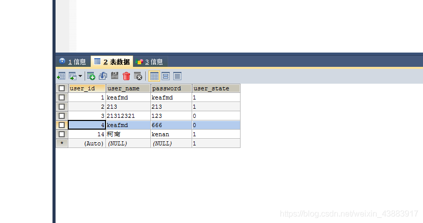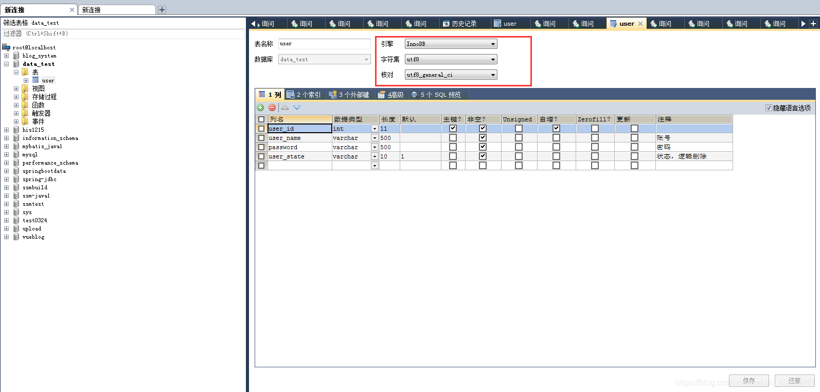 /* sqlyog enterprise v12.08 (64 bit) mysql - 5.7.31 : database - data_test ********************************************************************* */ /*!40101 set names utf8 */; /*!40101 set sql_mode=''*/; /*!40014 set @old_unique_checks=@@unique_checks, unique_checks=0 */; /*!40014 set @old_foreign_key_checks=@@foreign_key_checks, foreign_key_checks=0 */; /*!40101 set @old_sql_mode=@@sql_mode, sql_mode='no_auto_value_on_zero' */; /*!40111 set @old_sql_notes=@@sql_notes, sql_notes=0 */; create database /*!32312 if not exists*/`data_test` /*!40100 default character set latin1*/; use `data_test`; /*table structure for table `user` */ drop table if exists `user`; create table `user` ( `user_id` int(11) not null auto_increment, `user_name` varchar(50) character set latin1 not null comment '账号', `password` varchar(50) character set latin1 not null comment '密码', `user_state` varchar(10) character set latin1 not null default '1' comment '状态,逻辑删除', primary key (`user_id`) ) engine=innodb auto_increment=13 default charset=utf-8; /*data for the table `user` */ lock tables `user` write; insert into `user`(`user_id`,`user_name`,`password`,`user_state`) values (1,'keafmd','keafmd','1'),(3,'21312321','123','0'),(11,'213','213','1'),(12,'keafmd','666','0'); unlock tables; /*!40101 set sql_mode=@old_sql_mode */; /*!40014 set foreign_key_checks=@old_foreign_key_checks */; /*!40014 set unique_checks=@old_unique_checks */; /*!40111 set sql_notes=@old_sql_notes */;