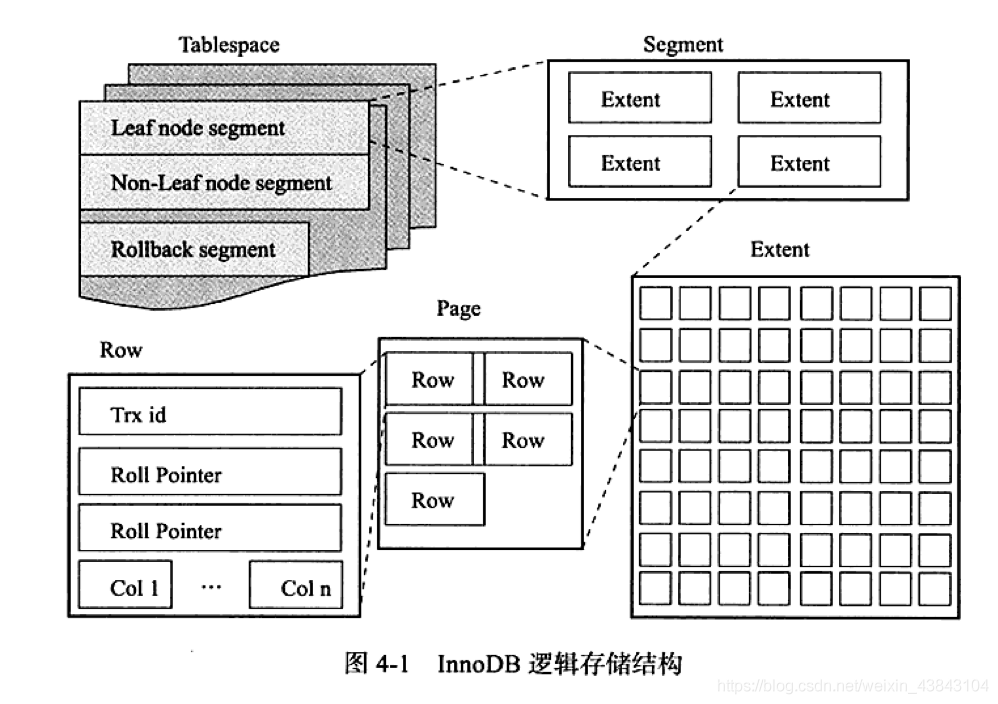 innodb存储引擎对undo的管理采用段的方式。rollback segment称为回滚段,每个回滚段中有1024个undo log segment。