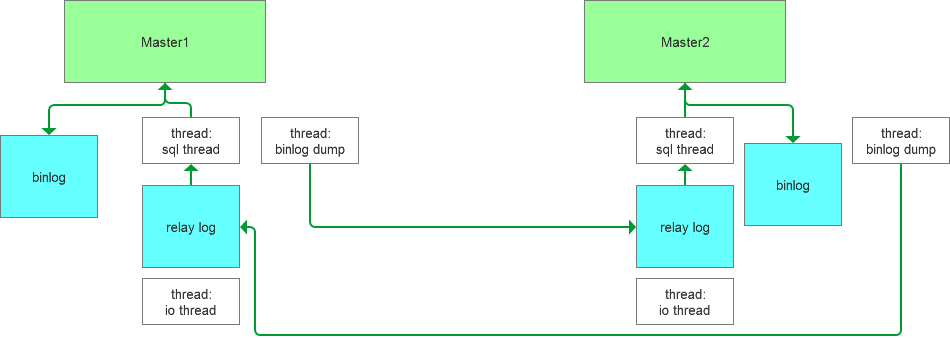 那么master1生成binlog,推送数据变化到master2,在master2上面生成relay log,然后交由sql thread进行变更重放,反之也是类似的流程,整个流程可以这样描述。