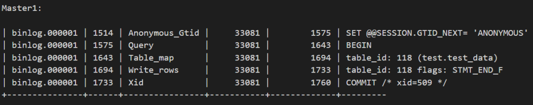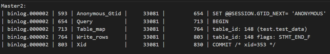 在master2端,我们查看binlog的情况,在开启binlog_rows_query_log_events的前提下会看到明显少了事件:rows_query.