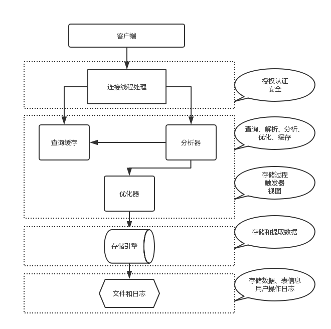 mysql架构总共四层,在上图中以虚线作为划分。