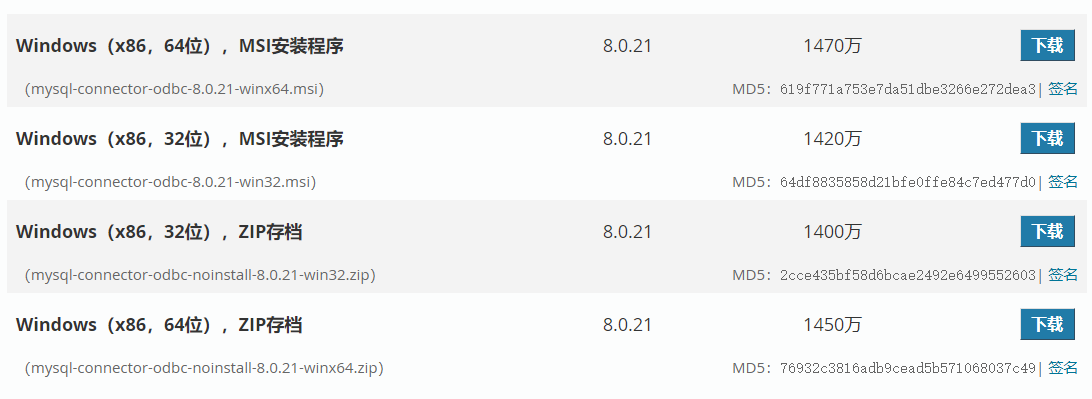 下载链接:https://dev.mysql.com/downloads/connector/odbc/,对应使用MySQL 8.0版本。
