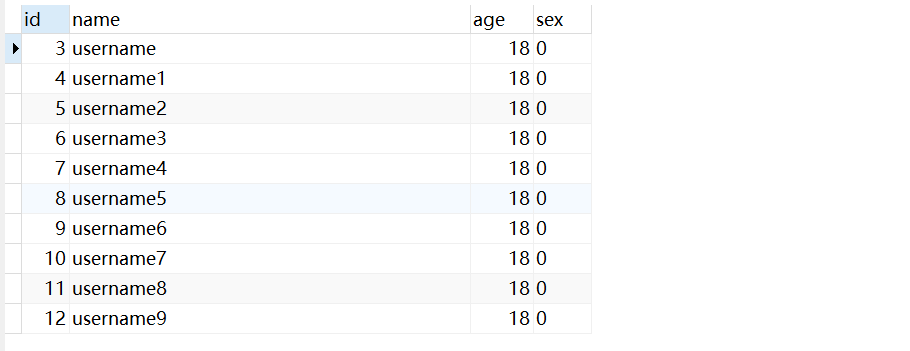 INSERT INTO user(id,name,age,sex) value(startNum,user_name,18,"0");
