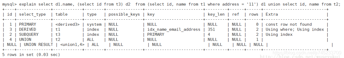 - (id = 3):【select id, name from t1 where address = ‘11'】:因为是在 from 语句中包含的子查询所以被标记为 derived(衍生),where address = ‘11' 通过复合索引 idx_name_email_address 就能检索到,所以 type 为 index。