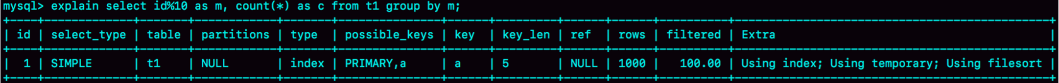 这个语句的逻辑是把表 t1 里的数据,按照 id%10 进行分组统计,并按照 m 的结果排序 后输出。它的 explain 结果如下: