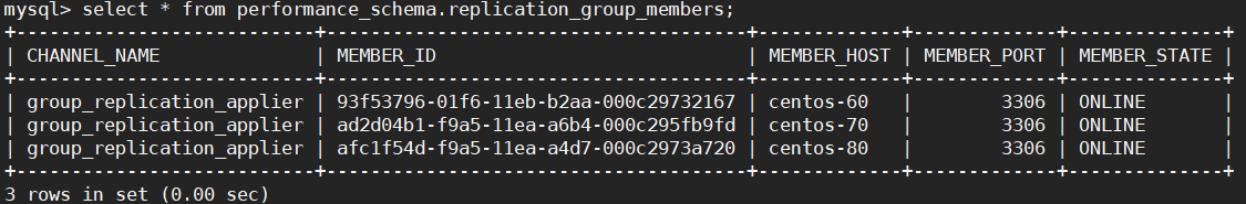 select * from performance_schema.replication_group_members; #查看复制组状态