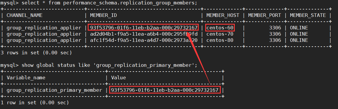 show global status like 'group_replication_primary_member'; #查看复制组中主库是谁