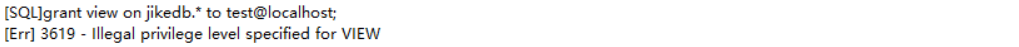-- view:视图的权限(mysql8.0+赋权限出错)ERROR 3619 (HY000): Illegal privilege level specified for VIEW,如下图所示。