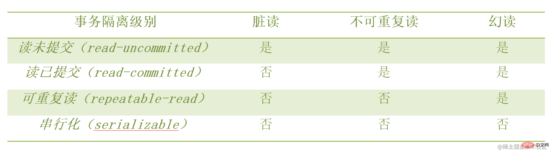 隔离级别越高,效率就越低,很多时候,我们必须在两者之间找到平衡。SQL标准的事务隔离级别包括:读(取)未提交(read uncommitted)、读(取)已提交(read committed)、可重复读取(repeatable read)和串行化(serializable )。