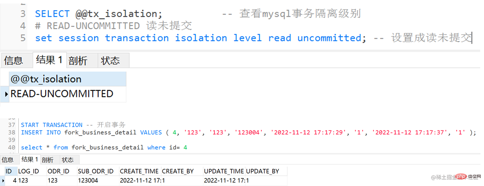 set session transaction isolation level read uncommitted; -- 设置成读未提交 SELECT @@tx_isolation; -- 查看mysql事务隔离级别 START TRANSACTION -- 事务A INSERT INTO fork_business_detail VALUES ( 4, '123', '123', '123004', '2022-11-12 17:17:29', '1', '2022-11-12 17:17:37', '1' ); ROLLBACK select * from fork_business_detail where id= 4 -- 事务B