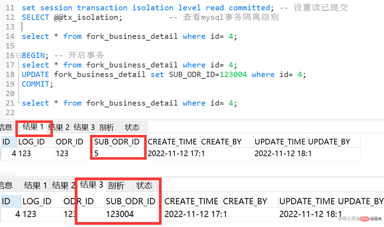 select * from fork_business_detail where id= 4; BEGIN; -- 开启事务 select * from fork_business_detail where id= 4; UPDATE fork_business_detail set SUB_ODR_ID=123004 where id= 4; COMMIT; select * from fork_business_detail where id= 5;
