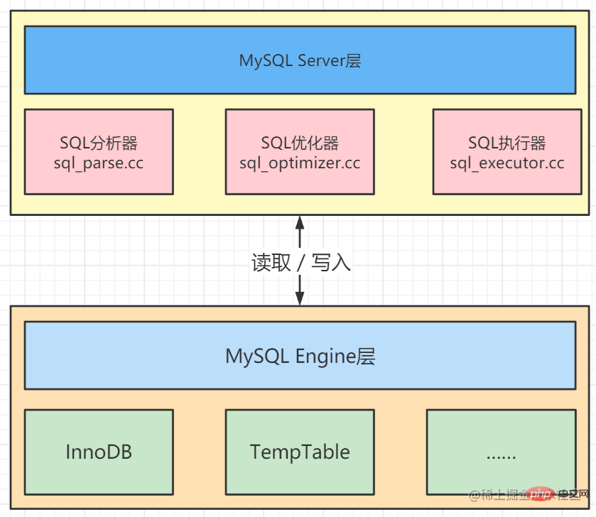 MySQL数据库由Server(服务器)层和Engine(引擎)层组成。