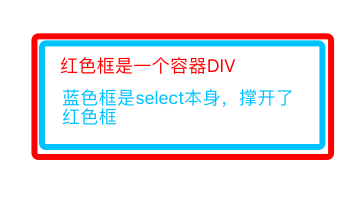 而我们要做的就是将蓝色框的真正select,做一个彻底透明和隐藏,当我们点击div的时候,其实点击的是select本身,由于select被透明化,所以我们会看到点击红色框div的时候,