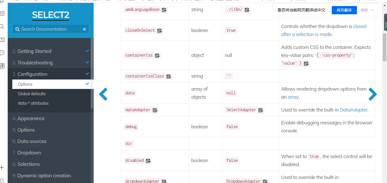 在select2文档的第三项中的options里面有一张配置表里面涵盖了select2所有的属性(英文差的我看的有点吃力)