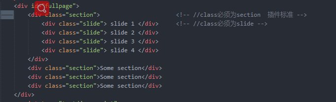 将这段代码复制到body里开始编写页面 在div的class值,section 以及后面的slide是不能更改的,我们必须按照fillpage的规则来 但最外层div的id可以直接设置,用于js代码中的选择