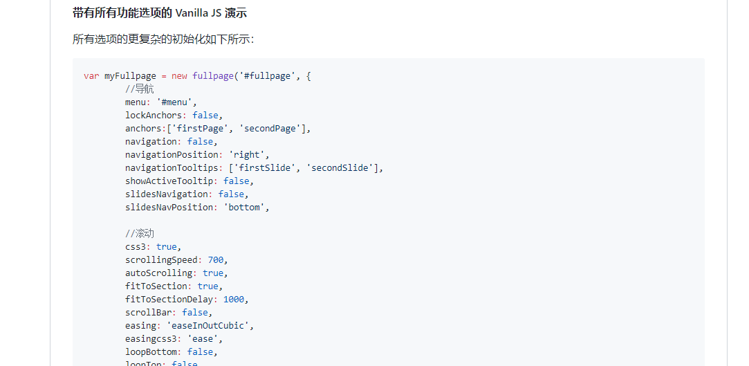 在fullpage文档上有着很多属性(往下翻的话有对这些属性一 一的解释)