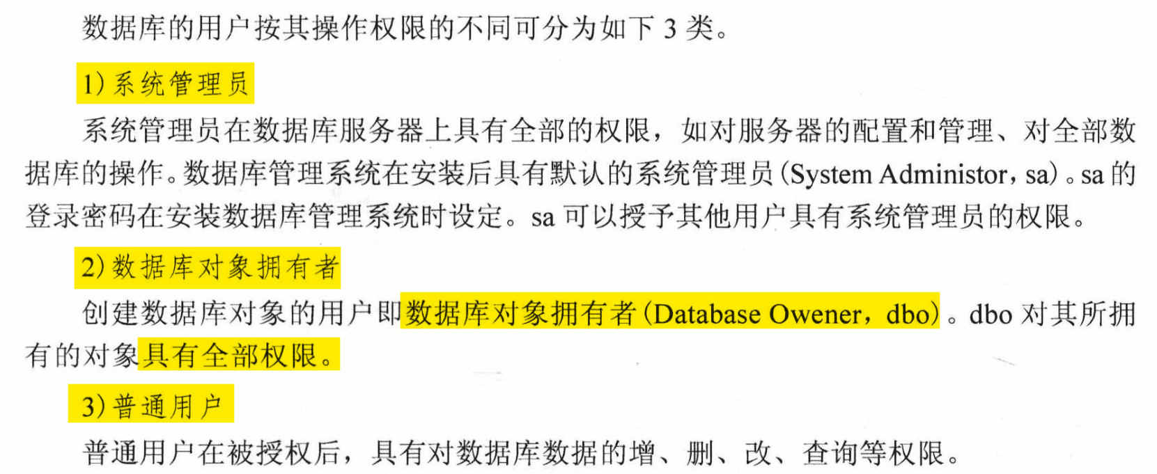 用户具有登录名后,可以成功登录数据库服务器,但并不具备访问任何用户数据库的权限。只有成为数据库的合法用户后,才能访问该数据库。 数据库用户是数据库级别上的主体。数据库用户一般都来自于服务器上已有的登录名,让登录名成为数据库用户的操作称为映射。 一个登录名可以映射为多个数据库中的用户。新建立的数据库只有一个用户 dbo,是数据库的拥有者。
