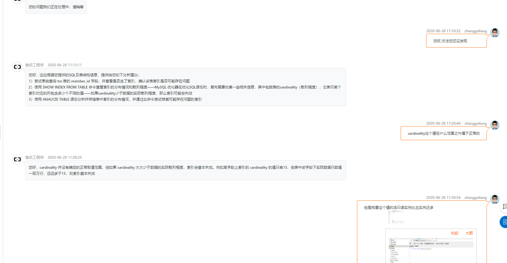 前面也是按照阿里客服给的建议去查询了一下,主实例和从实例的索引状况.发现差别其实不大.过了大概几十分钟主实例又OK了.很是奇怪,当时我们讨论了一下得出的结论就是可能阿里云出现波动之类的了.这个问题后面就没有再次发生