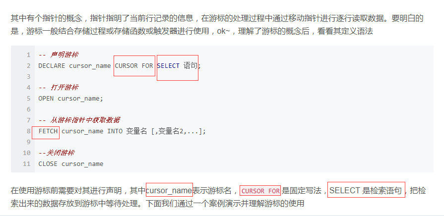在前面的分析中可知sql的检索操作返回的数据几乎都是以整个集合的形式,也就是说sql善于将多条查询记录集中到一起并返回,倘若现在需要一行行地处理查询的结果,这对于sql语句来说确实是个难题,好在存在一种称为游标的技术可以解决这个问题,所谓的游标就就是可以将检索出来的数据集合保存在内存中然后依次取出每条数据进行处理,这样就解决了sql语句无法进行行记录处理的难题,游标的读取图解如下: