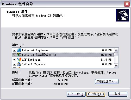 3,点击“添加/删除Windows组件”后稍等片刻。出现“Windows组件向导”窗口。从中打勾“选择Internet信息服务(IIS)”