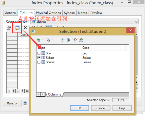 在indexes标签页添加,然后通过索引属性视图中的columns标签页添加索引列。