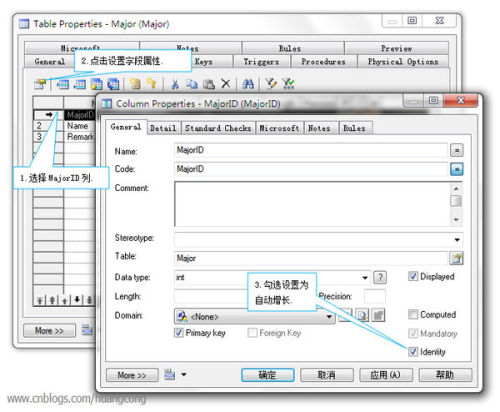 6.因为MajorID字段我们要设置为自动增长,所以要设置它的高级属性,选择MajorID字段,点击属性按钮,在General面板中勾选上Identity复选框: