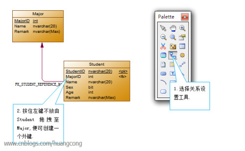 8.接着是为Student创建一个MajorID外键,使用PowerDesigner可以很轻松的完成这个工作,选择关系设置工具,在Student表上按住左键不放,拖拽至Major表,便可为Student表添加一个MajorID的外键: