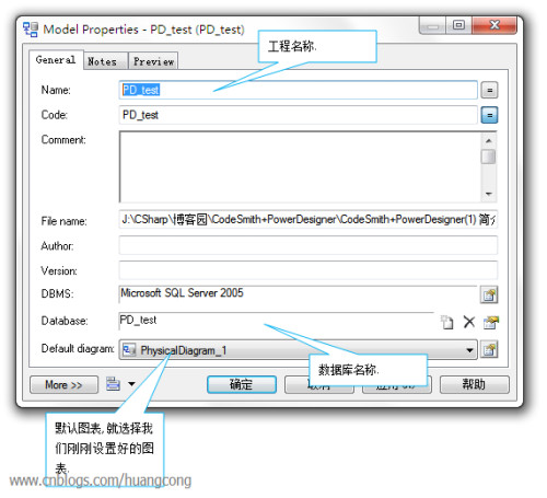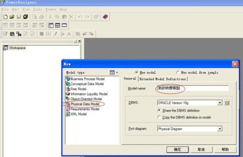 2.File—New Model—Physical Data Model—Physical Diagram—Model name?设置为test,DBMS属性设置为Microsoft SQL Server 2005: