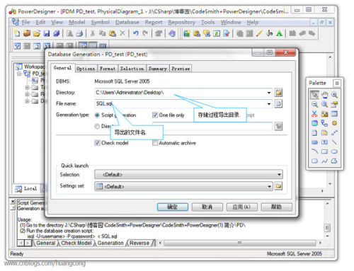 10好了,在此我们对新数据库的设置已经完成,但是在SQL中还是空空如也啊,我们要怎么把这边设计好的结构移植到SQLServer 2005中呢?执行操作:Database—Generate Database,设置好存储过程导出目录和文件名,点击确定即可: