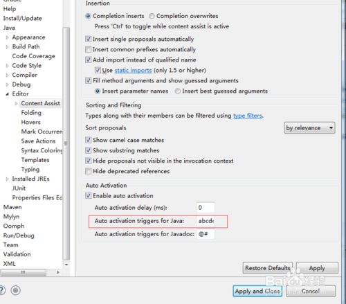 3.下面有三个选项,找到第二个“Auto activation triggers for Java:”选项,在其后的文本框中会看到一个“.”存在。这表示:只有输入“.”之后才会有代码提示和自动补全,我们要修改的地方就是这里。把该文本框中的“.”换掉,换成“abcdefghijklmnopqrstuvwxyz.”,这样,你在Eclipse里面写Java代码就可以做到按“abcdefghijklmnopqrstuvwxyz.”中的任意一个字符都会有代码提示。
