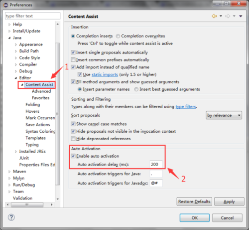 1.打开eclipse后一次点Window->Perferences->Java -> Editor -> Content Assist