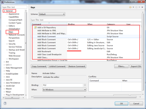 ②找到【General】==>【Keys】,窗口右边就会出现所有快捷键。