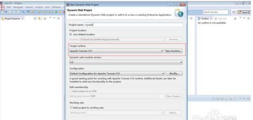 当你完成了添加tomcat的配置之后,在eclipse中找到File-->new-->Dynamic web project界面中就会出现tomcat服务器的下拉选择。如下图:
