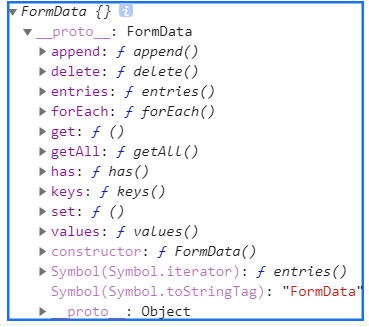 FormData 对象的实例方法有很多,可以在控制台输出formData对象看到它的实例对象,以下列举四个常用的