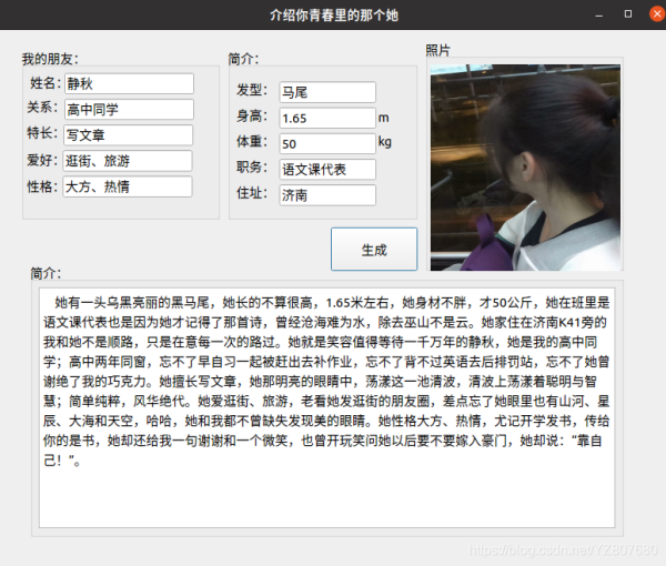 # 系统包 import sys from pyqt5 import qtcore, qtgui, qtwidgets # 项目包 from ui_mainwindow import ui_mainwindow class cjianjie: hair = "" height = "" weight = "" office = "" address = "" bmi=0.0 def outputhair(self): stroutput = "她有一头乌黑亮丽的黑" + self.hair return stroutput def outputheight(self): stroutput = "她长的不算很高,"+ self.height + "米左右" return stroutput def outputweight(self): stroutput = "她身材不胖,才" + self.weight + "公斤" return stroutput def outputoffice(self): stroutput = "她在班里是" + self.office + "也是因为她才记得了那首诗,曾经沧海难为水,除去巫山不是云" return stroutput def outputaddress(self): stroutput = "她家住在" + self.address + "k41旁的我和她不是顺路,只是在意每一次的路过" return stroutput def outputresume(self): stroutput = " " + self.outputhair() + "," stroutput = stroutput + self.outputheight() + "," stroutput = stroutput + self.outputweight() + "," stroutput = stroutput + self.outputoffice() + "。" stroutput = stroutput + self.outputaddress() + "。" return stroutput class cfriend(cjianjie): name = "" restionship = "" speciatly = "" hobby = "" character = "" def outputname(self): stroutput = "她就是笑容值得等待一千万年的" + self.name return stroutput def outputrestionship(self): stroutput = "她是我的"+ self.restionship + ";高中两年同窗,忘不了早自习一起被赶出去补作业,忘不了背不过英语去后排罚站,忘不了她曾谢绝了我的巧克力" return stroutput def outputspecialty(self): stroutput = "她擅长" + self.speciatly + ",她那明亮的眼睛中,荡漾这一池清波,清波上荡漾着聪明与智慧;简单纯粹,风华绝代" return stroutput def outputhobby(self): stroutput = "她爱" + self.hobby + ",老看她发逛街的朋友圈,差点忘了她眼里也有山河、星辰、大海和天空,哈哈,她和我都不曾缺失发现美的眼睛" return stroutput def outputcharacter(self): stroutput = "她性格" + self.character + ",尤记开学发书,传给你的是书,她却还给我一句谢谢和一个微笑,也曾开玩笑问她以后要不要嫁入豪门,她却说:“靠自己!”" return stroutput def outputresume(self): stroutput= cjianjie.outputresume(self) stroutput = stroutput+ self.outputname() + "," stroutput = stroutput + self.outputrestionship() + "。" stroutput = stroutput + self.outputspecialty() + "。" stroutput = stroutput + self.outputhobby() + "。" stroutput = stroutput + self.outputcharacter() + "。" return stroutput class cmainwindow(qtwidgets.qmainwindow, ui_mainwindow): def __init__(self, parent = none): super(cmainwindow, self).__init__(parent) self.setupui(self) # 主窗体设置 self.show() def generate(self): f = cfriend() f.hair = self.txthair.text() f.height = self.txtheight.text() f.weight = self.txtweight.text() f.office = self.txtoffice.text() f.address = self.txtaddress.text() f.name = self.txtname.text() f.restionship = self.txtrelationship.text() f.speciatly= self.txtspecialty.text() f.character= self.txtcharacter.text() f.hobby = self.txthobby.text() self.txtresume.settext(f.outputresume()) if __name__ == '__main__': app = qtwidgets.qapplication(sys.argv) mainwindow = cmainwindow() sys.exit(app.exec_())