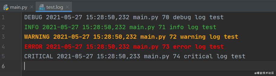 debug 2021-05-27 00:04:26,327 main.py 65 debug log test info 2021-05-27 00:04:26,327 main.py 66 info log test warning 2021-05-27 00:04:26,327 main.py 67 warning log test error 2021-05-27 00:04:26,327 main.py 68 error log test critical 2021-05-27 00:04:26,327 main.py 69 critical log test