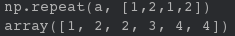 np.repeat(a, [1, 2, 1, 2]) # 如果第二个参数是列表,列表长度必须和a的复制可选元素数目相等,这里都是4