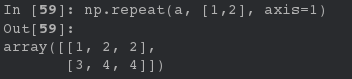 np.repeat(a, [1, 2], axis=1) # 第二个参数是列表,列表长度必须和a的复制可选元素数目相等,这里是2