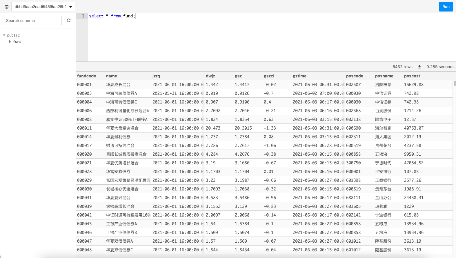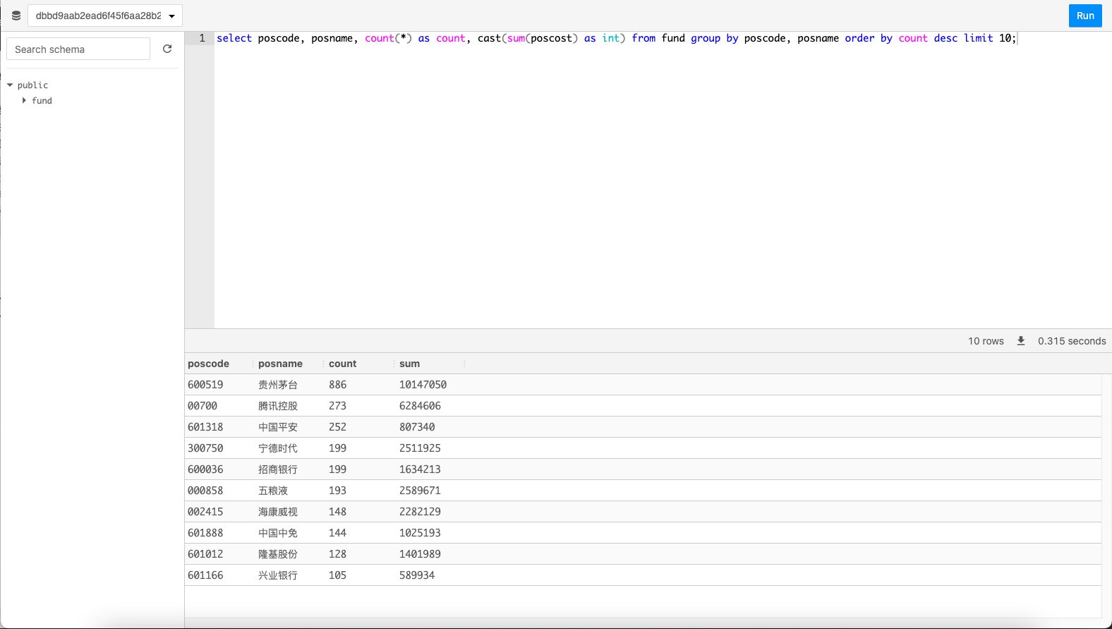 15.接下来让我们来看看这些基金最喜欢买哪些股票吧。输入sql语句select poscode, posname, count(*) as count, cast(sum(poscost) as int) from fund group by poscode, posname order by count desc limit 10;