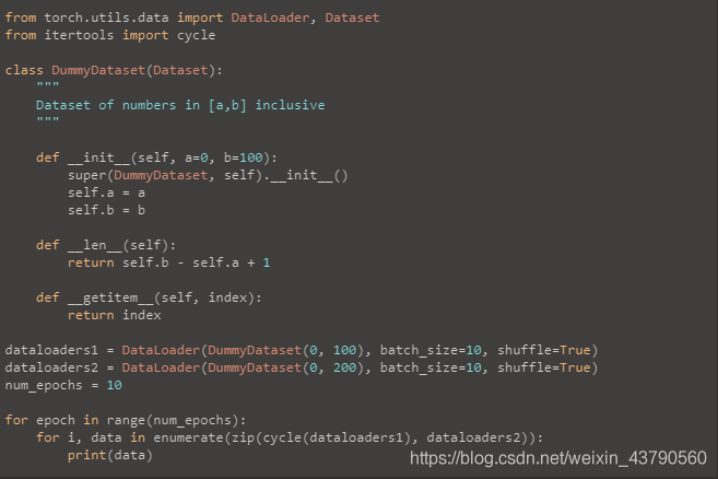 仅使用zip,迭代器将在长度等于最小数据集的长度时耗尽。 但是,使用cycle时,我们将再次重复最小的数据集,除非迭代器查看最大数据集中的所有样本。
