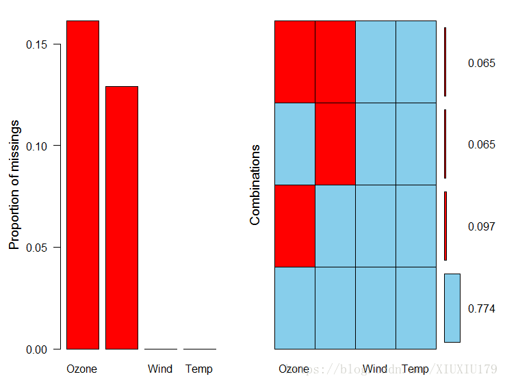> air_data = airquality[1:7,1:4] > is.na(air_data) ozone solar.r wind temp 1 false false false false 2 false false false false 3 false false false false 4 false false false false 5 true true false false 6 false true false false 7 false false false false > sum(is.na(air_data)) [1] 3 > complete.cases(air_data) [1] true true true true false false true > complete.cases(air_data$ozone) [1] true true true true false true true is.na用来分析数据中是否含有缺失值,complete.cases则是判断每一行是否有缺失值,当数据量变大时,利用aggr()函数进行判断。 > air_data = airquality[1:31,1:4] > aggr(air_data, las = 1, numbers = t)