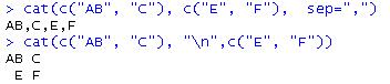 cat(... , file = "", sep = " ", fill = false, labels = null, append = false)