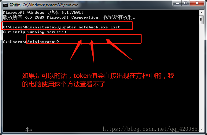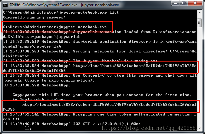 直接输入【jupyter-notebook.exe】回车即可,方框处即是所需要的token了,两处都是一样的: