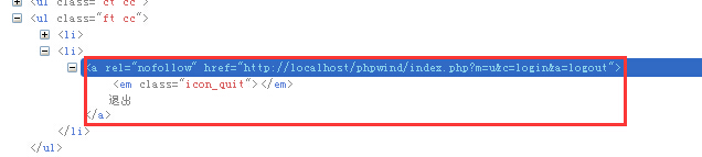 这段代码中的“退出”这个超链接,没有标准id元素,只有一个rel和href,不是很好定位。不妨我们就用xpath的几种模糊匹配模式来定位它吧,主要有三种方式,举例如下。