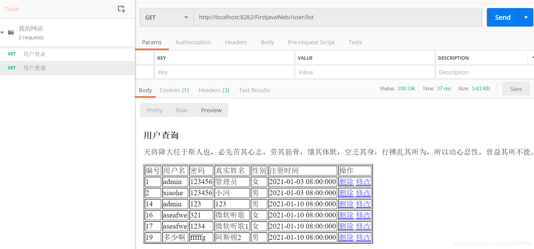 这节介绍接口测试工具postman的基本使用方法, 测试系统就是2.8节自己开发的具有用户增删改查操作的web应用程序——[firstjavaweb]()。 执行测试前,确保firstjavaweb应用程序处于启动中。