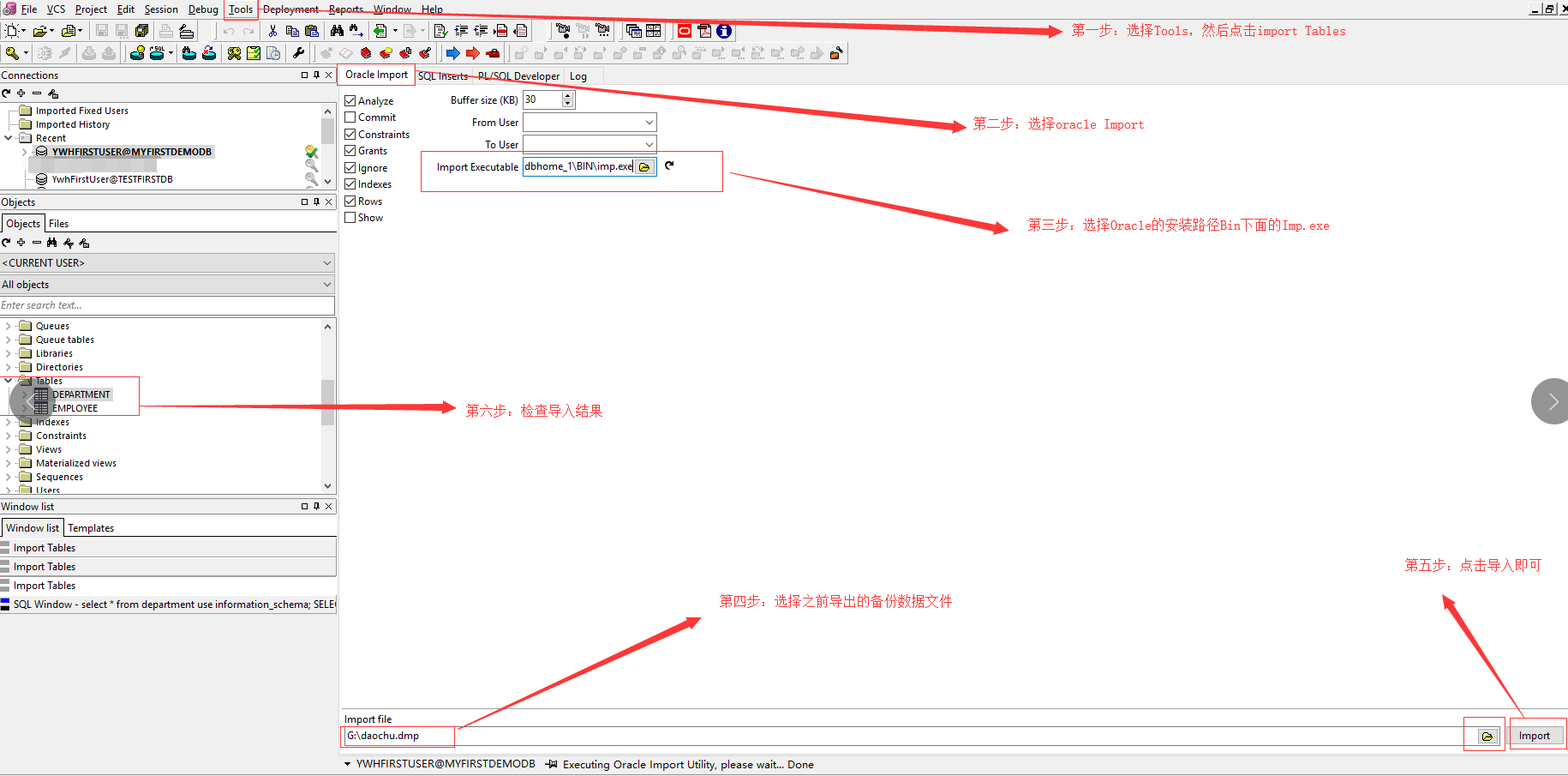 找到菜单tools=>import tables,弹出以下对话框,按照以下图片操作