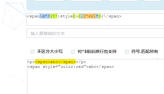 1)以 '.*' 为分界,前面括号中的内容可以划分为 ‘?<=' 和 ‘<(\w+)>',其中‘<(\w+)>'表示匹配尖括号里面是字母、数字或下划线的内容,类似<span>,外面还要加个括号是要实现分组;而‘?<='用到的是零宽断言语法,表示的是断定‘<(\w+)>'后面有或没有内容,而且与内容的间隔宽度为零。