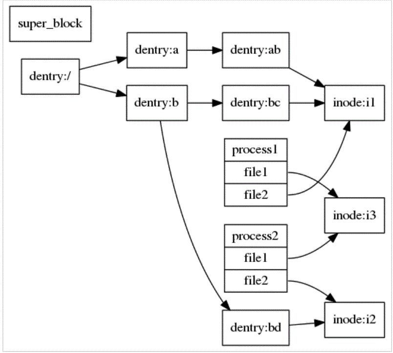 图中其实inode是串联在super_block上的,super_block维护了文件系统中`inodes,因为画上去太乱了所以省略了。